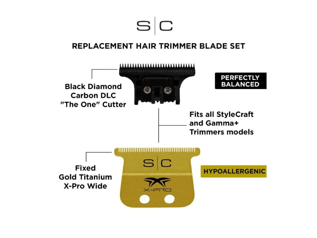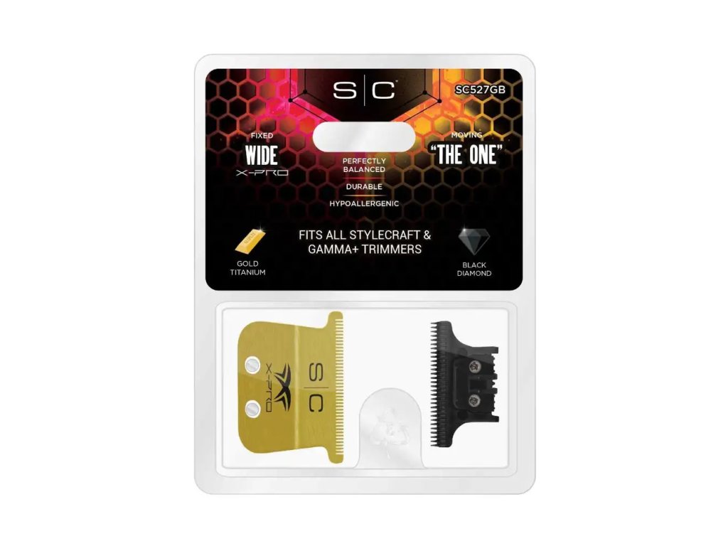 Prémiová sada náhradních čepelí StyleCraft X‑PRO Wide Gold + The One DLC je ideální pro široké a rychlé střihy, precizní konturování a profesionální výsledky. Navrženo pro barbery, kteří chtějí maximální výkon a luxusní vzhled.